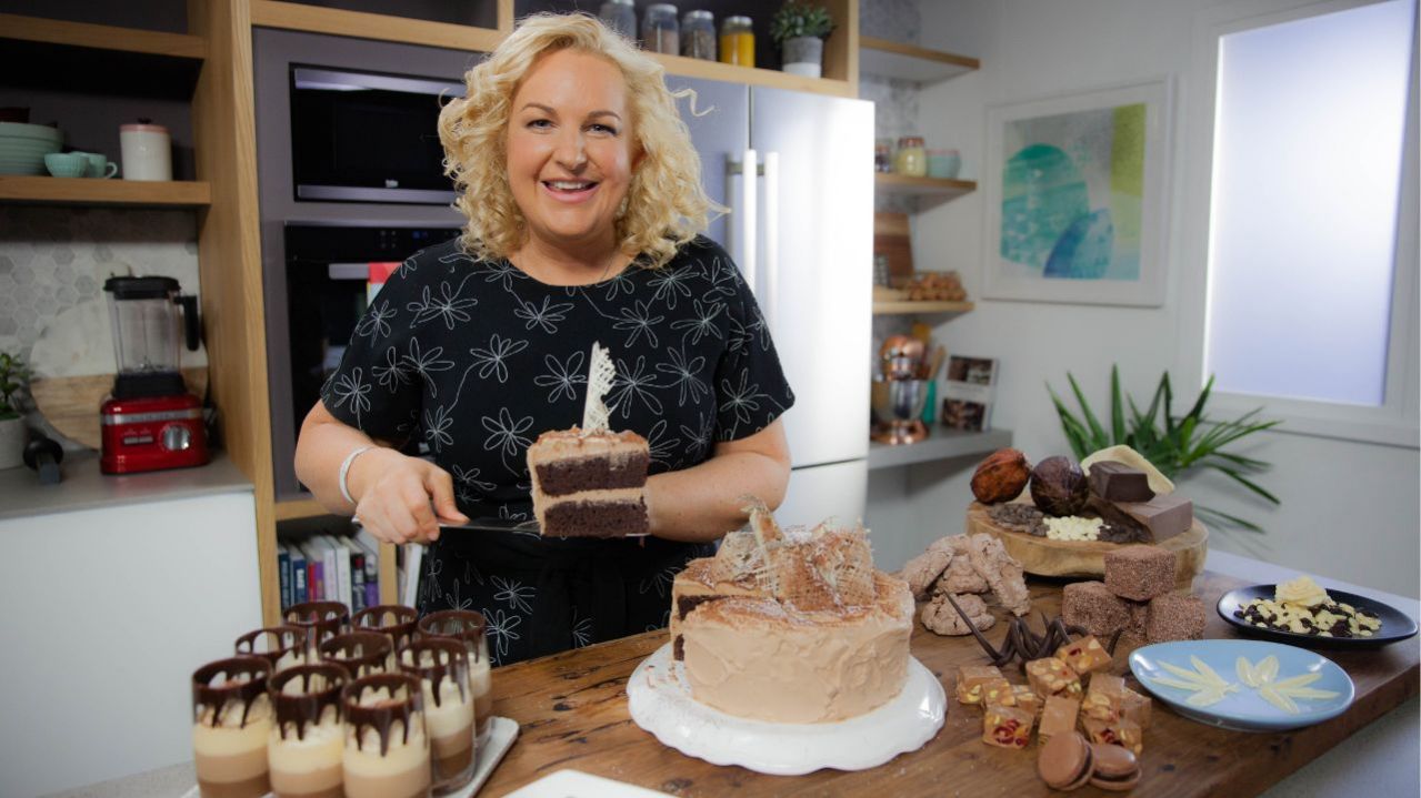 מלכת השוקולד 3 - פרק 4 מלכת השוקולד קירסטן טיבולס מכינה ארטיקי למינגטון, סוכריות שוקולד ואגוזים, כוסות שוקולד במילוי קרמל ועוגת שוקולד עם פטל ומרנג. ש.ח.